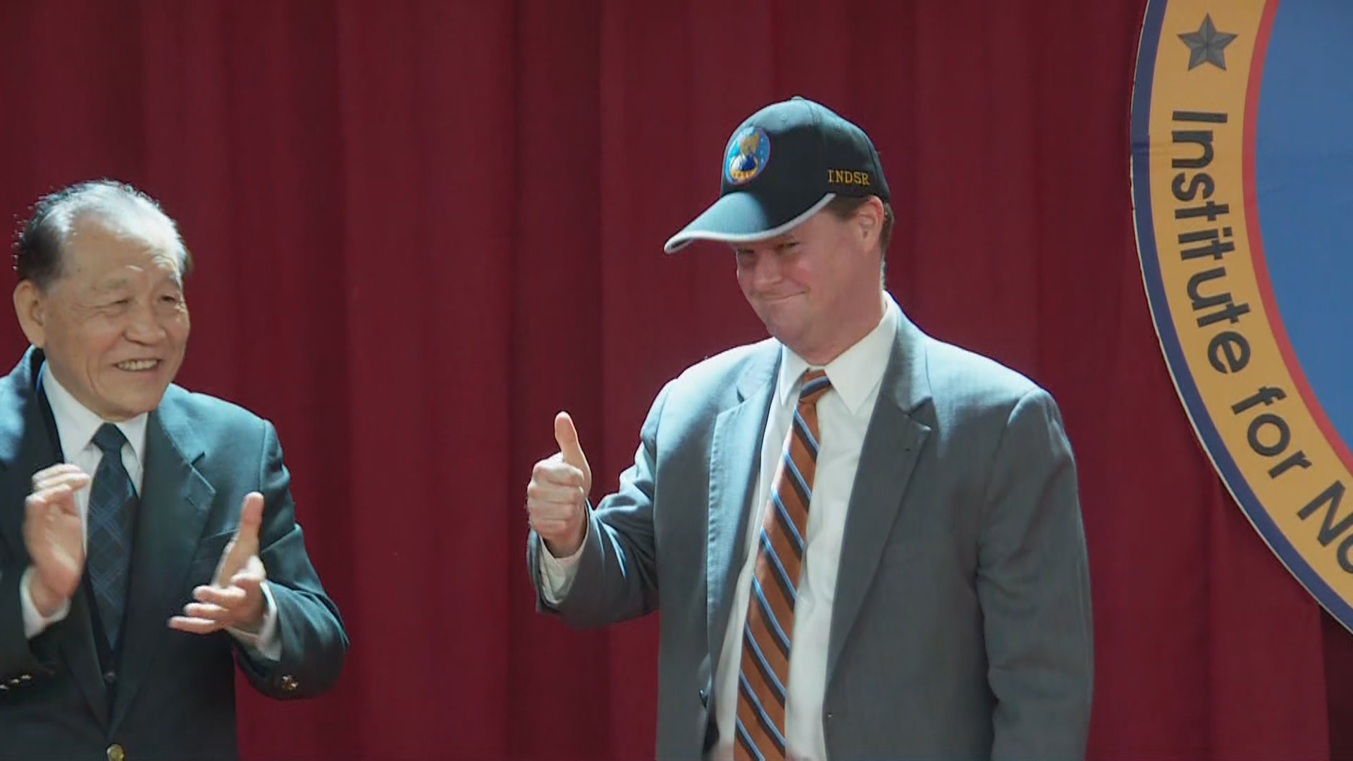 美前印太助理防長薛瑞福,19日在台北的國防安全研究院演講,主題台美關係與印太安全。演講後接受國安院董事長霍守業致贈紀念帽。(攝影/新唐人王冠霖)