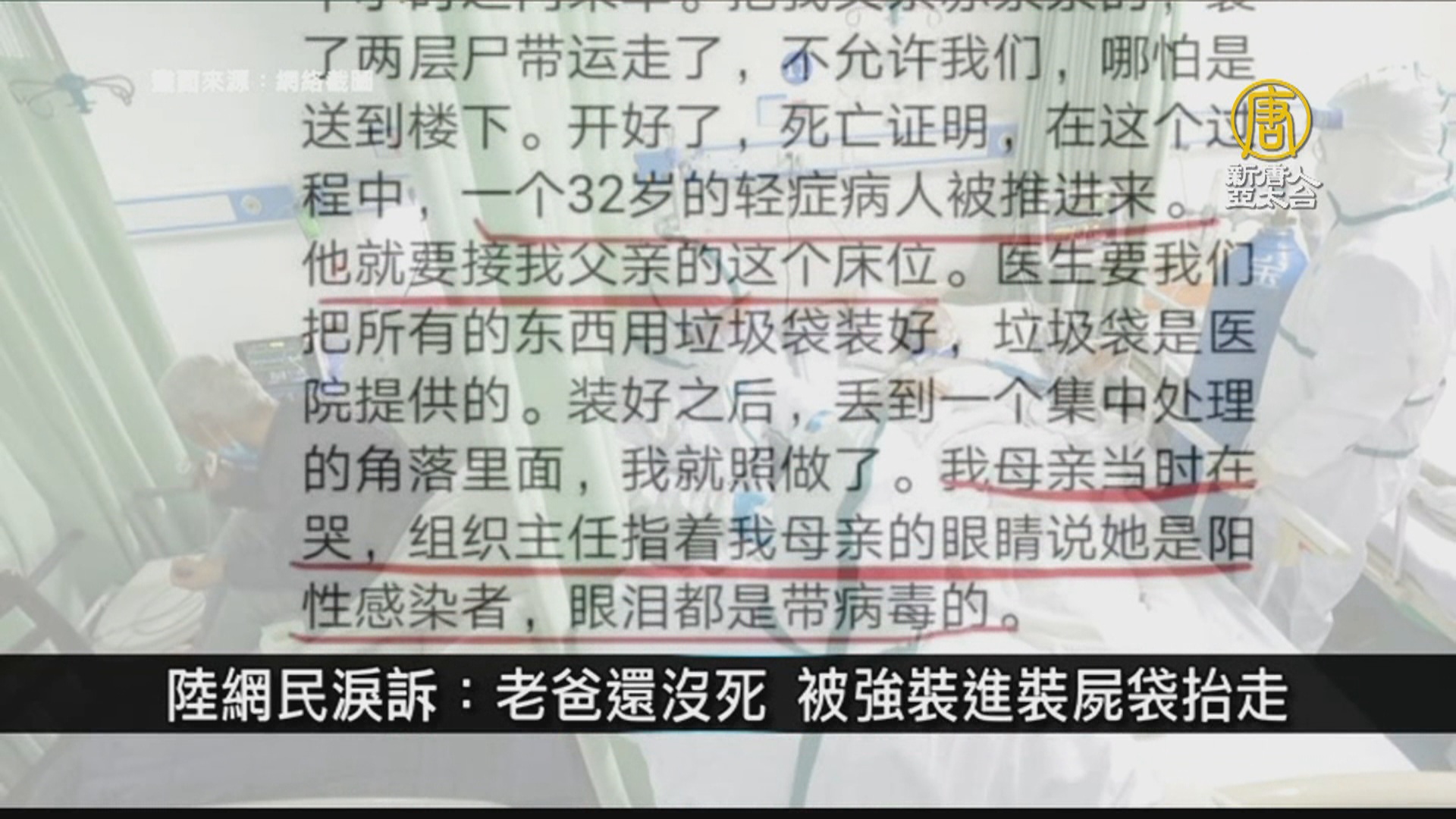 【新唐人亞太台 2020 年 02 月 20 日訊】陸網民淚訴:老爸還沒死 被強裝進裝屍袋抬走