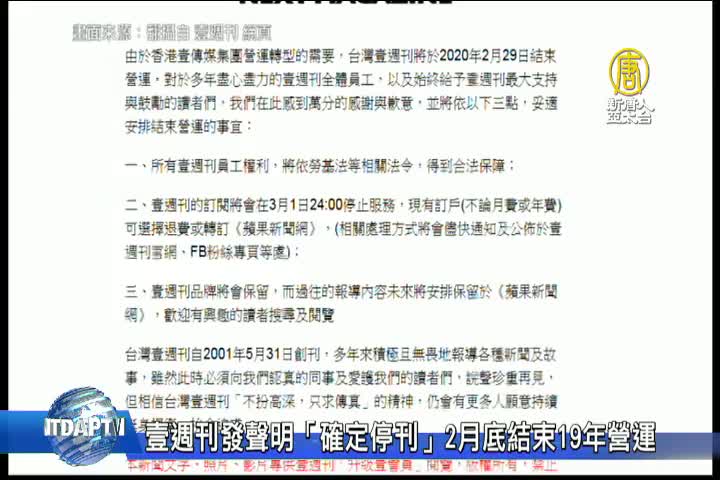 【新唐人亞太台 2020 年 02 月 20 日訊】台灣壹週刊今天(20日)發表聲明,因應香港壹傳媒集團營運轉型需要,將在2月底結束營運,並提出3點規劃,安排結束營運事宜,強調保障員工權利,以及訂戶後續處理。壹週刊自2001年5月31日創刊,將八卦新聞與狗仔文化,帶入台灣新聞媒體業界,對台灣新聞界,有著相當大的影響,據媒體報導,壹週刊不堪長期虧損,在與壹傳媒行政總裁張劍虹討論後,決定2月底結束營運,將由總編輯邱銘輝對全體員工宣布消息,結束在台灣19年的發行。