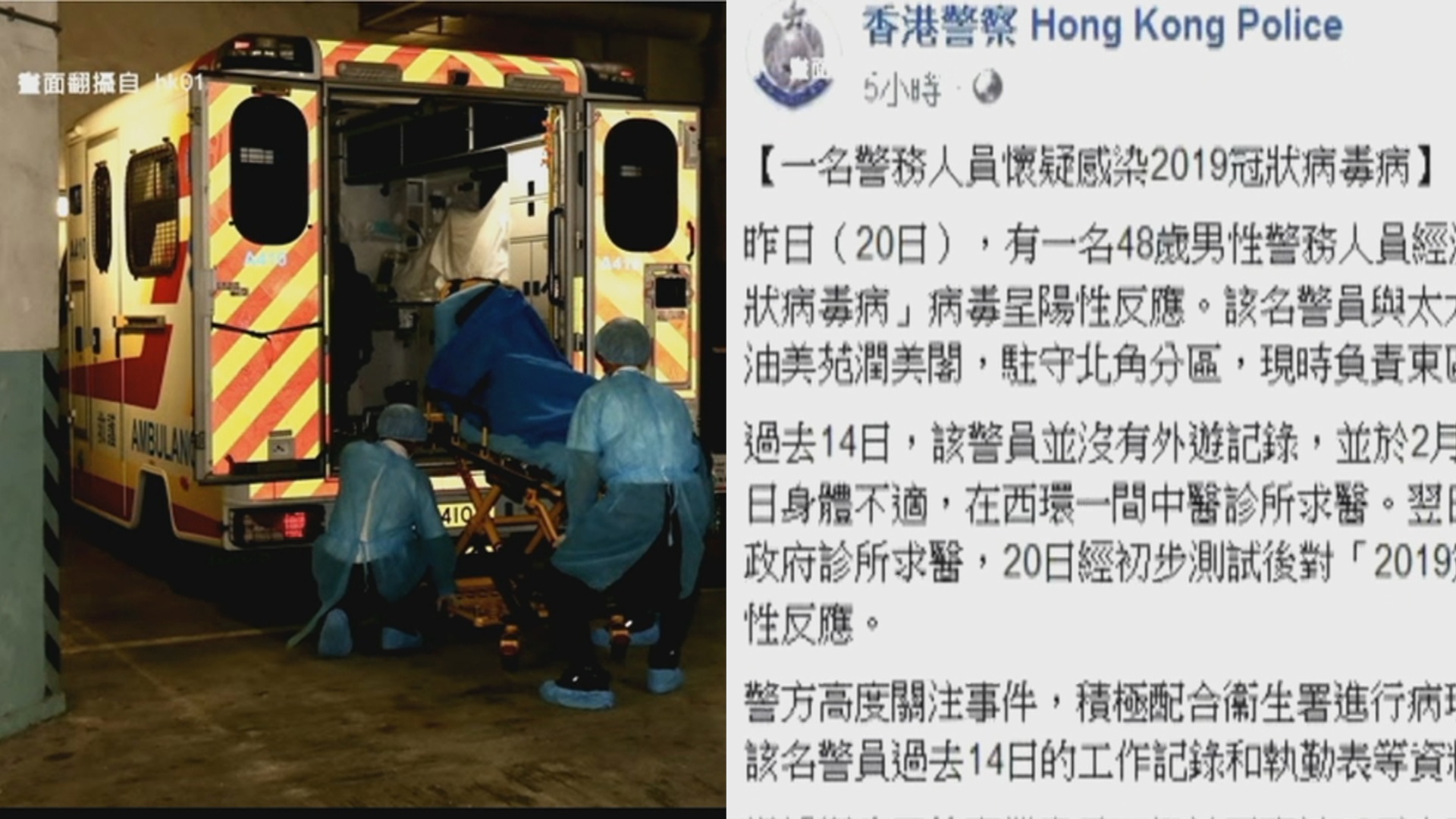 【新唐人亞太台 2020 年 02 月 21 日訊】昨天(20日)港府首度證實,有港警確診武漢(中共)肺炎,[切]警方表示,這名48歲男警駐守北角警署,近期被調往東區第二梯隊防暴隊。確診警員這個星期二(18日)發燒,當天沒有上班;但晚上出席同袍退休聚會,長達約4個半小時。港警今天(21日)凌晨表示,根據衞生署的專業意見,當晚出席的其他59名警務人員聚餐,被界定為密切接觸者,須接受檢疫,避免與市民接觸。而這名港警的妻子和岳母,現在也出現症狀,正住院接受治療。