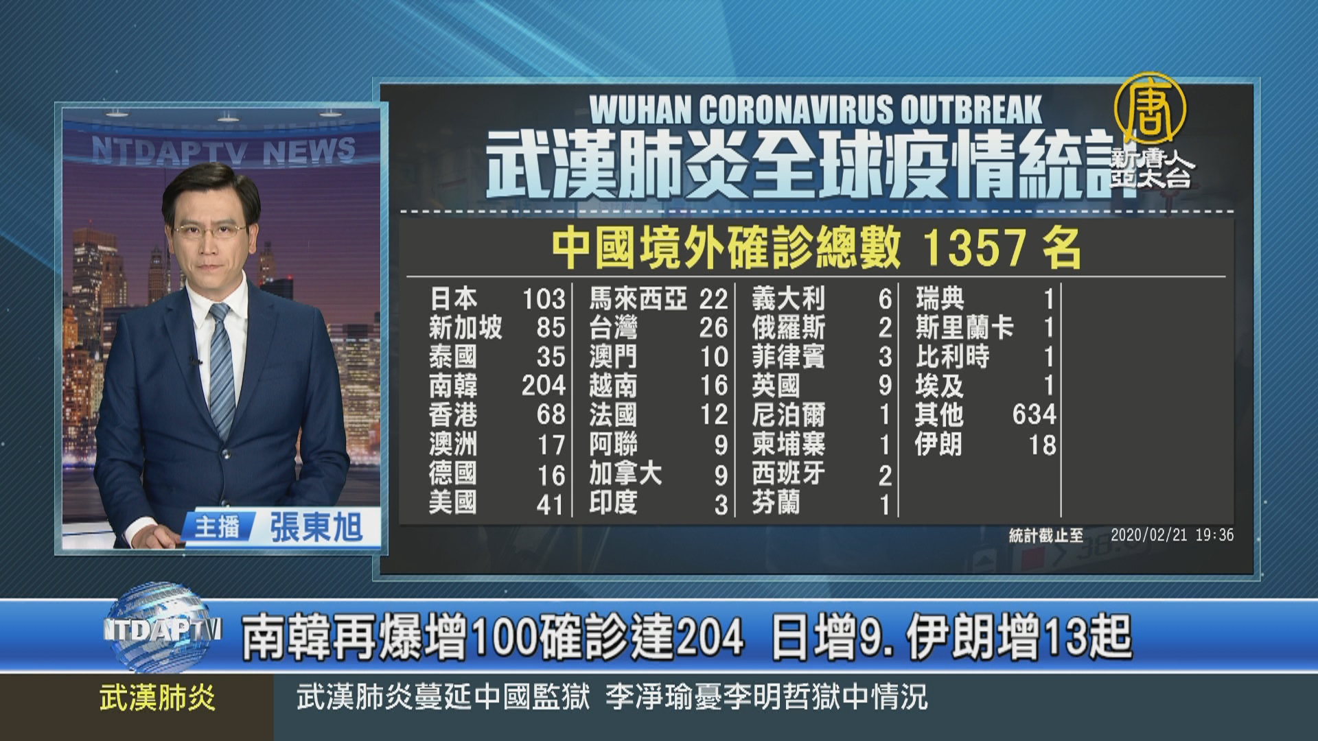 【新唐人亞太台 2020 年 02 月 21 日訊】再來帶您瀏覽武漢(中共)肺炎各國的確診數據,台灣今天新增2名確診達26例,南韓則是再度爆增確診病例,早上新增52起,下午又增48例,光是今天單日就增加100例,累計達204例。日本新增9例確診,境內累積103例。