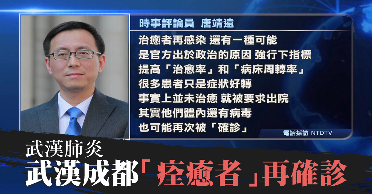 時事評論員 唐靖遠:「治癒者再感染」還有一種可能是官方出於政治原因,強行下指標提高治愈率和病床周轉率,很多患者只是症狀好轉,事實上並未治癒,就被要求出院。其實他們體內還有病毒,也有可能被再次「確診」。如果是這種情況,他被強制出院後必然成為傳染源,本人病情也可能惡化,這是很不負責任的做法。」