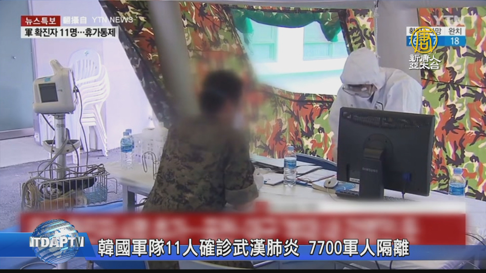 YTN主播:「在軍隊裡面,確診感染武漢(中共)肺炎的患者增加到11人。國防部已經隔離了7700多名士兵,其中包括最近訪問大邱和慶北的士兵,兵役檢查也暫停兩週。」