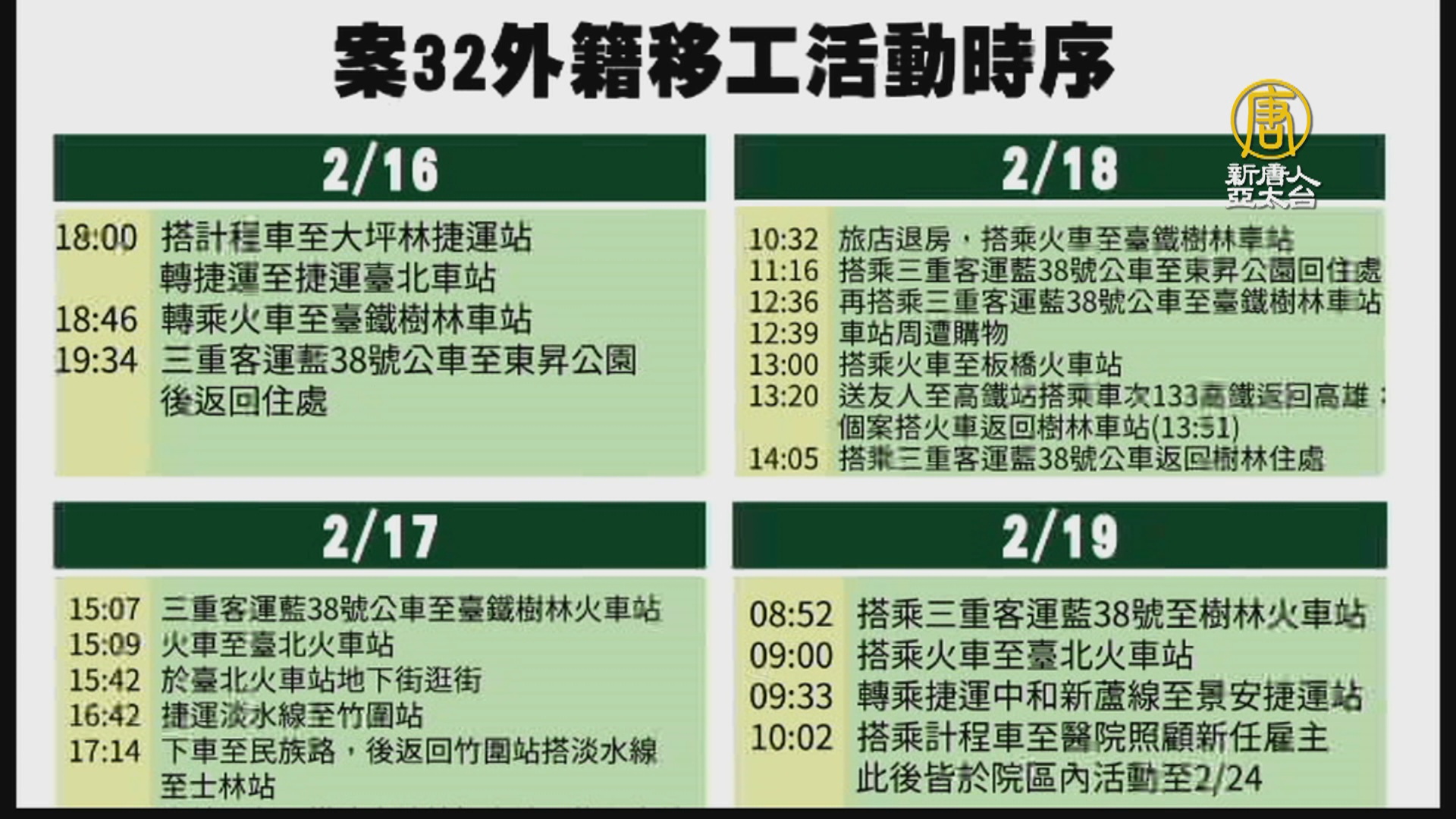 【新唐人亞太台 2020 年 02 月 27 日訊】帶您關心,中央流行疫情指揮中心,今天公布第32例確診個案,2月16日到19日曾經去過的地方。第32例確診的非法外籍女移工,在這四天曾經搭乘計程車、客運、捷運、台鐵以及高鐵,並且曾經南下高雄。指揮中心提醒民眾,如果這四天有到相關地點進行戶外活動或搭乘交通工具,有任何症狀都要馬上通報。