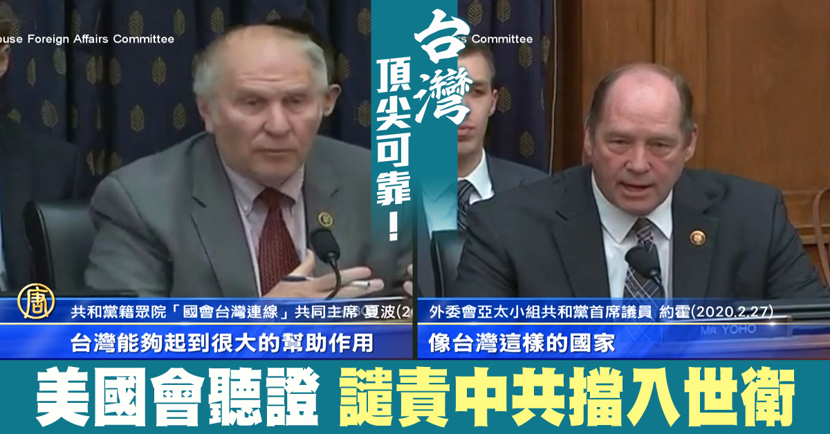 【新唐人亞太台 2020 年 02 月 28 日訊】27號,美國聯邦眾議院外交委員會舉行中共肺炎聽證會。會上多位眾議員關注台灣因為中共干預,被世界衛生組織排除在外的問題。共和黨籍眾院「國會台灣連線」共同主席夏波表示,台灣有世界最頂尖醫療人員,甚至比中共還有用。