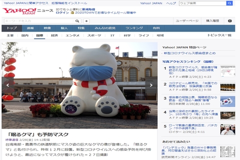 【新唐人亞太台 2020 年 02 月 29 日訊】中共肺炎疫情肆虐全球,日本疫情逐漸升高;日前,嘉義市火車站前一隻大白熊公共藝術戴上口罩提醒民眾防疫,意外成了日本Yahoo雅虎首頁「睡熊也有預防口罩」引述報導,台灣防疫作為更加受到全球關注。