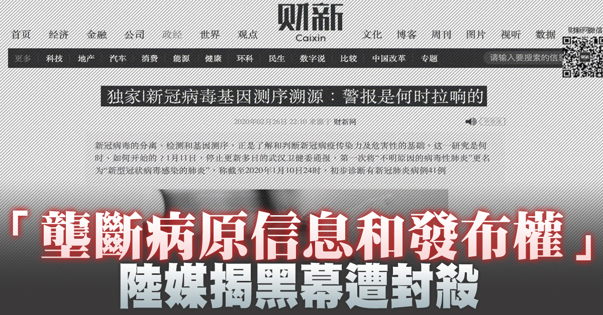 【新唐人亞太台 2020 年 02 月 29 日訊】大陸《財新網》2月26號發佈文章,揭示出:在中共肺炎疫情的初期,確定和報告「病原體」的過程,顯示出當局對信息的封殺。