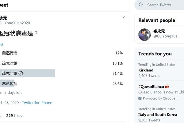 崔永元2月28日推出的民調顯示,75%的人認為武漢肺炎疫情是由於人工改造的病毒洩漏而造成的。(Twitter截圖)