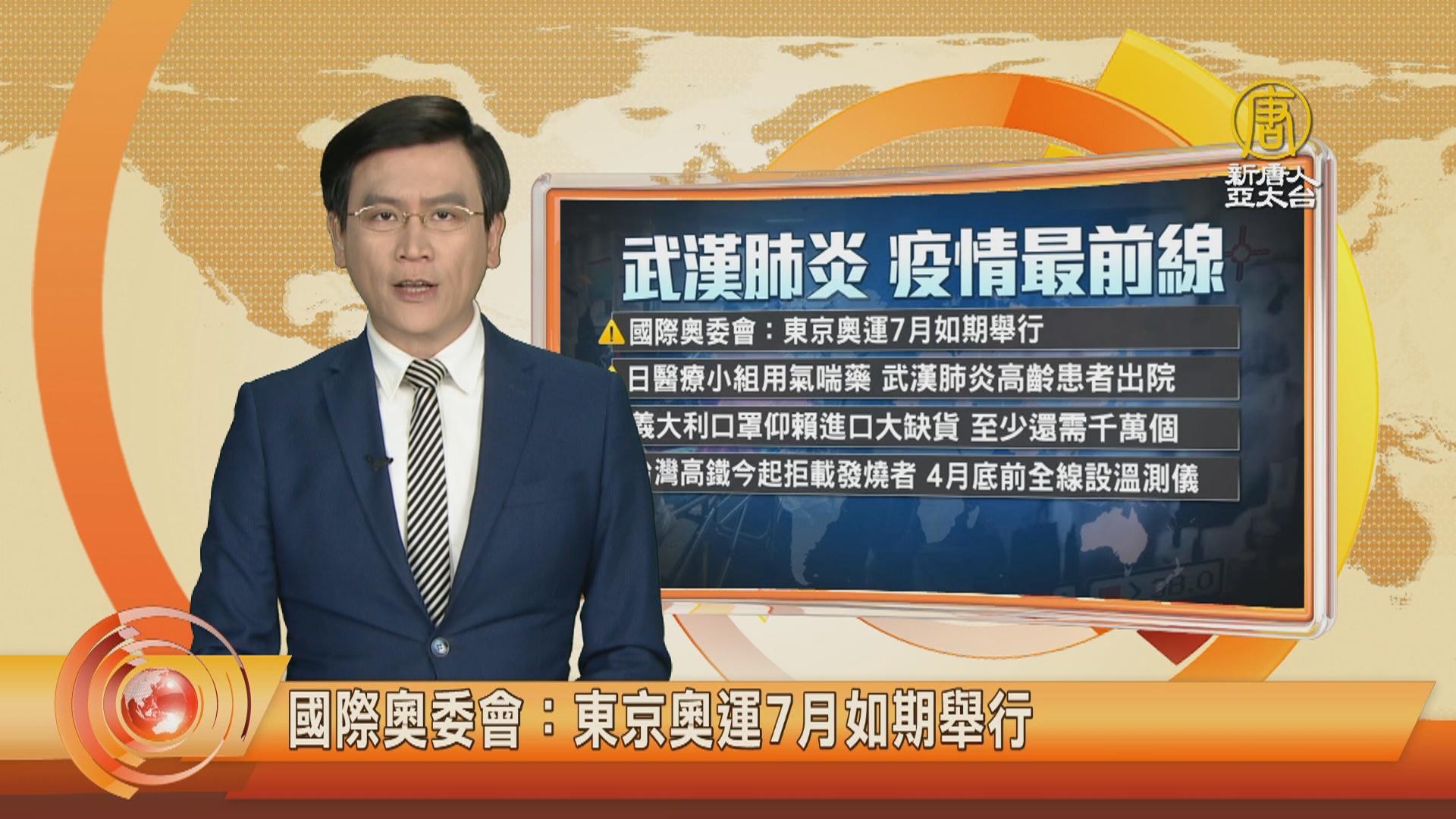 【新唐人亞太台 2020 年 03 月 04 日訊】接著帶您,快速掌握今天中共肺炎疫情追蹤重點。國際奧委會表示:東京奧運7月如期舉行。日本醫療小組用氣喘藥,中共肺炎高齡患者出院。以及,義大利口罩仰賴進口大缺貨 至少還需千萬個。台灣高鐵今起拒載發燒者,4月底前全線設溫測儀。
