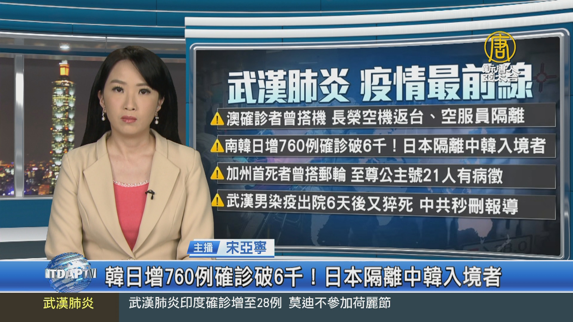 【新唐人亞太台 2020 年 03 月 05 日訊】武漢(中共)肺炎疫情在全球77個國家持續蔓延,在中國大陸之外的確診數目已經破萬,帶您快速掌握,今天武漢(中共)肺炎疫情追蹤重點,澳洲今天新增確診2人,其中一位五十八歲的男性,2日曾搭乘長榮航空,對此長榮表示:該航班將空機返台,接觸者立即隔離檢驗。南韓5日增加760例確診,累計突破6千人!日本防疫升級,3月9日起從中韓入境者需強制隔離。加州首位武漢(中共)肺炎死者,曾搭至尊公主號郵輪,目前船上21人有病徵,加州宣布進入緊急狀態,拒絕該郵輪停靠。武漢有男子染疫出院,不料6天後又猝死,但相關報導隨後又被中共當局刪除。