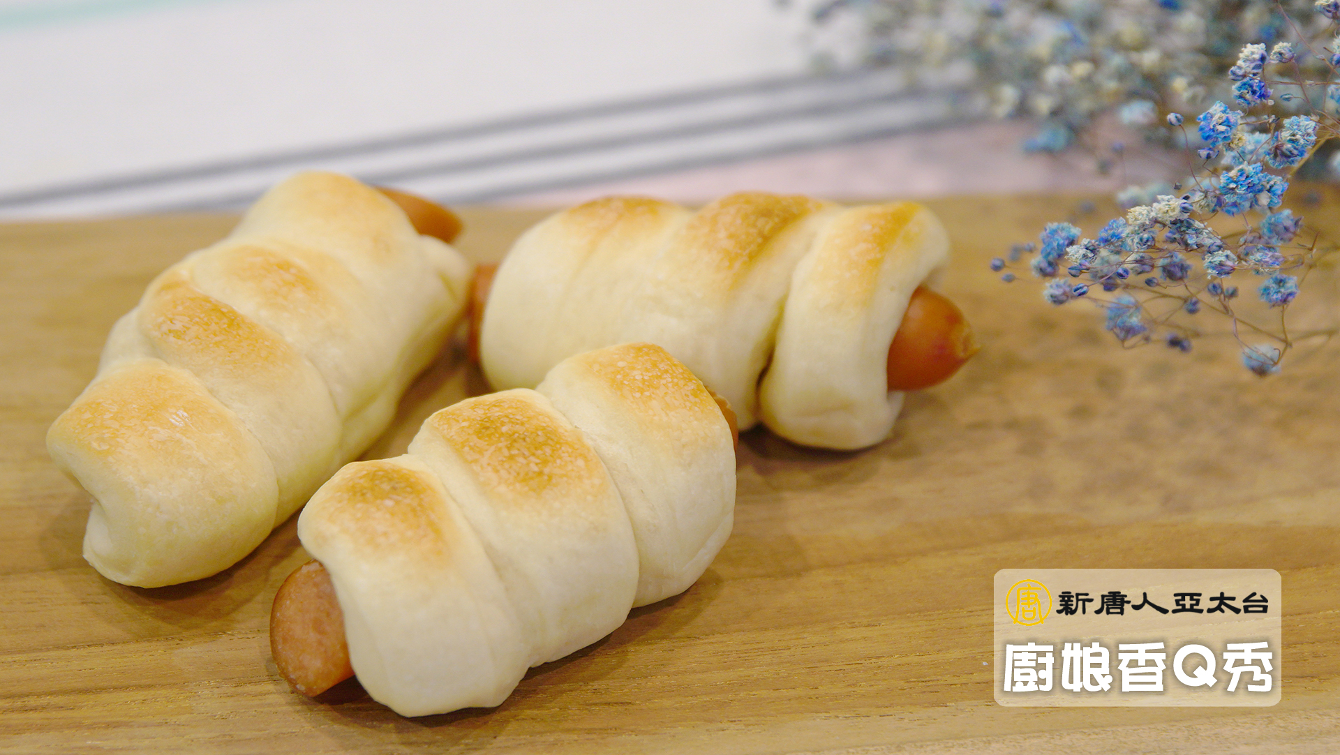 14. 香腸燙熟切半,麵團切長條,包上香腸。烘烤8分鐘即是德式香腸捲麵包。