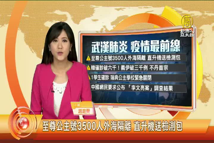 【新唐人亞太台 2020 年 03 月 06 日訊】午報頭條,先快速掌握今天武漢(中共)肺炎疫情追蹤重點。至尊公主號3500人外海隔離直升機送檢測包。韓確診破六千!義大利與伊朗確診數也都破三千例,不丹出現首宗。1學生確診 瑞典公主學校緊急關閉。中國網民要求公布 「李文亮案」調查結果。