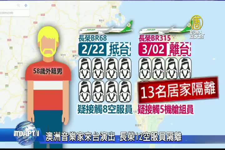 【新唐人亞太台 2020 年 03 月 06 日訊】好,澳洲一名音樂家返澳洲後確診武漢(中共)肺炎,而他上個月22日就從英國倫敦經泰國曼谷轉機飛來台灣,又從台灣飛回澳洲布里斯本,來台時就有咳嗽,第5天還曾因咳嗽、流鼻水就醫,2月28日、3月1日在國家音樂廳兩場演出。他前後搭了長榮2個班機,至少有12名空服員因為有接觸,需要居家隔離。