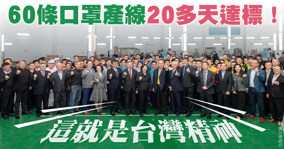 因為疫情延燒,為了紓解口罩荒,行政院在2月底建置60條生產線,原本要耗費半年的工程,在近30家企業合力支援開工下,只花了20幾天就完成任務。