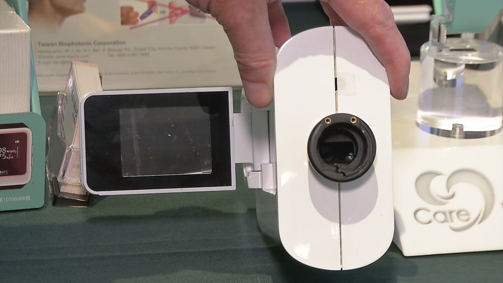 醫材光電科技公司協理 范植訓:「不需要扎血就可以測量血糖值了,一般來講,它只要在眼睛的地方,它雷射光會打到你的眼睛,量測你的眼睛的糖份。」