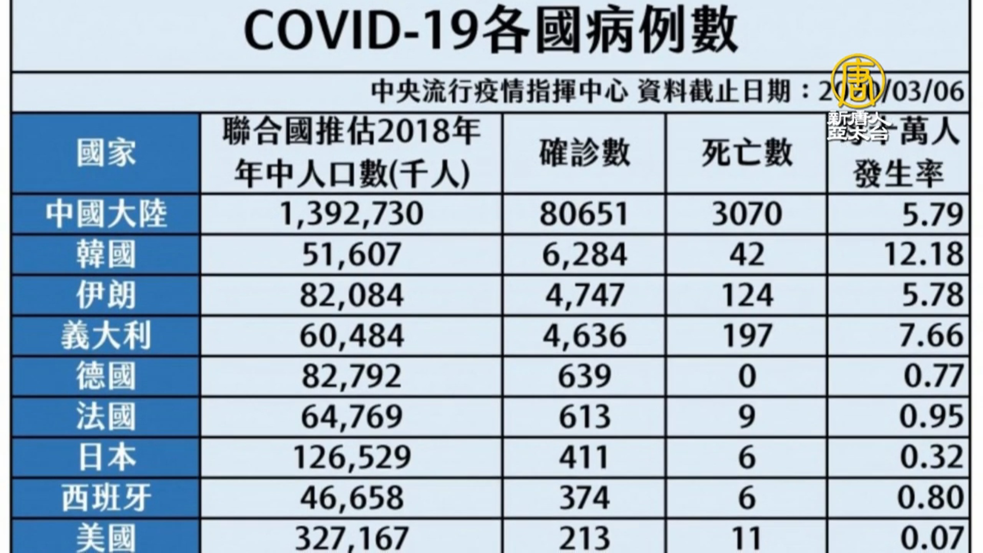 【新唐人亞太台 2020 年 03 月 07 日訊】中共肺炎疫情在延燒各國,台灣中央流行疫情指揮中心今天宣布提升法、德、西三國的旅遊疫情建議,並公布各國病例確診數、死亡數,特別是每十萬人發生率,最高的是南韓,高達12.18,接下來是義大利7.66。指揮官陳時中說,雖然南韓的發生率很高,但他們非常積極採檢病患,因此發生率會衝高,而其他國家比較是有重症發生,才會被列為確診,不一定是真的發生率較低。其中中國的確診數字,就備受網友質疑,而我國發生率是0.19,僅美國比台灣還低。