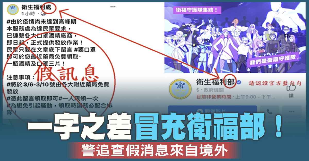 【新唐人亞太台 2020 年 03 月 07 日訊】正當防疫作戰期間,網路上卻是假訊息頻傳,甚至由假冒海軍司令部訊息,提到新兵訓練中心有人確診中共肺炎,中央流行疫情指揮中心執行官周志浩今天下午表示,已和軍方聯繫,確認沒有這個訊息。海軍司令部隨後也緊急召開記者會,鄭重澄清沒有發布任何有關疫情新聞稿,籲請國人勿傳播及聽信不實訊息,將追究造謠者的責任。另外,臉書最近也出現一個名為「衛生福利處」的粉絲專頁,以相似名稱冒充「衛生福利部」,並使用相同照片作為大頭照,企圖混淆民眾視聽,並張貼假訊息文章,刑事局表示,不排除假訊息可能來自境外,已著手追查,也提醒民眾切勿相信不實謠言。據剛立法通過的特別條例規定,傳播疫情假訊息,最高可關三年,罰新台幣3百萬!