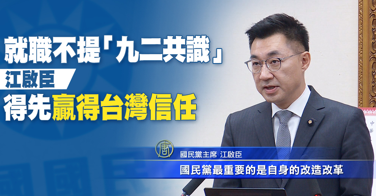 【新唐人亞太台 2020 年 03 月 09 日訊】國民黨今天舉行新任主席就職典禮,對於兩岸關係,任黨主席江啟臣在致詞時表示,國民黨此刻最重要的是自身的改革,必須得先重新贏得台灣社會的信任,才能有意義地去談如何拉近兩岸共識。而在今天就職典禮上,江啟臣並沒有談到,過去國民黨與中共的九二共識。
