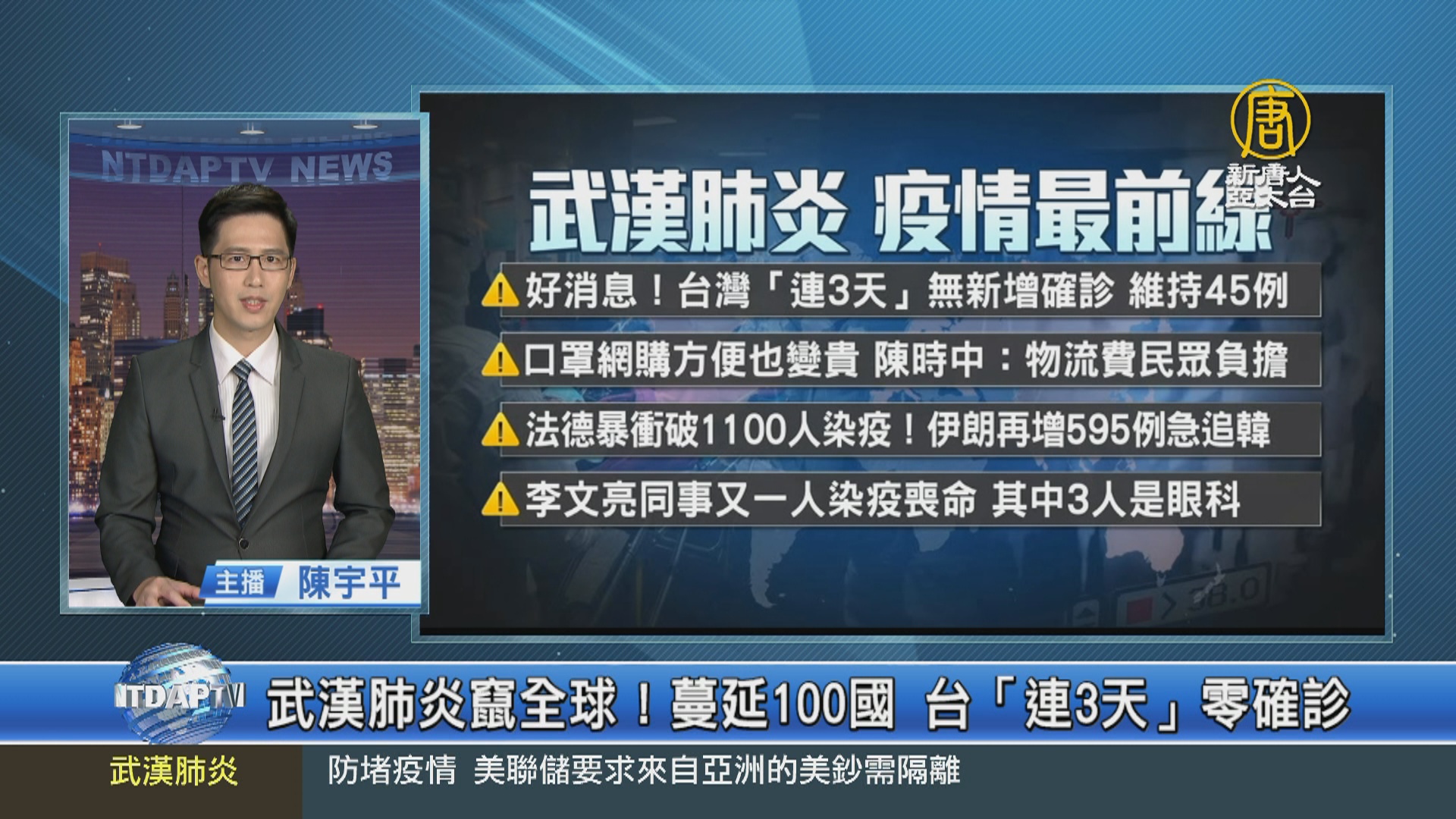 【新唐人亞太台 2020 年 03 月 09 日訊】中共肺炎全球流竄,從中國擴散後,病毒目前已經蔓延至全球100個國家,新聞先帶您關心疫情訊息重點。台灣有好消息,「連3天」無新增確診個案,維持在45例。口罩實名制2.0將上路,具體作法明天公布,可以網購超商取貨,指揮中心透露,物流費規劃由民眾自行負擔,但不會比口罩貴。法國與德國,雙雙破1100人確診中共肺炎!伊朗今天再新增595例,累計超過七千一百人確診,直逼韓國的7478例。中共肺炎的吹哨者李文亮,又有一名同事因染疫喪命,武漢市中心醫院因此去世的四名醫師中,其中有3人是眼科。