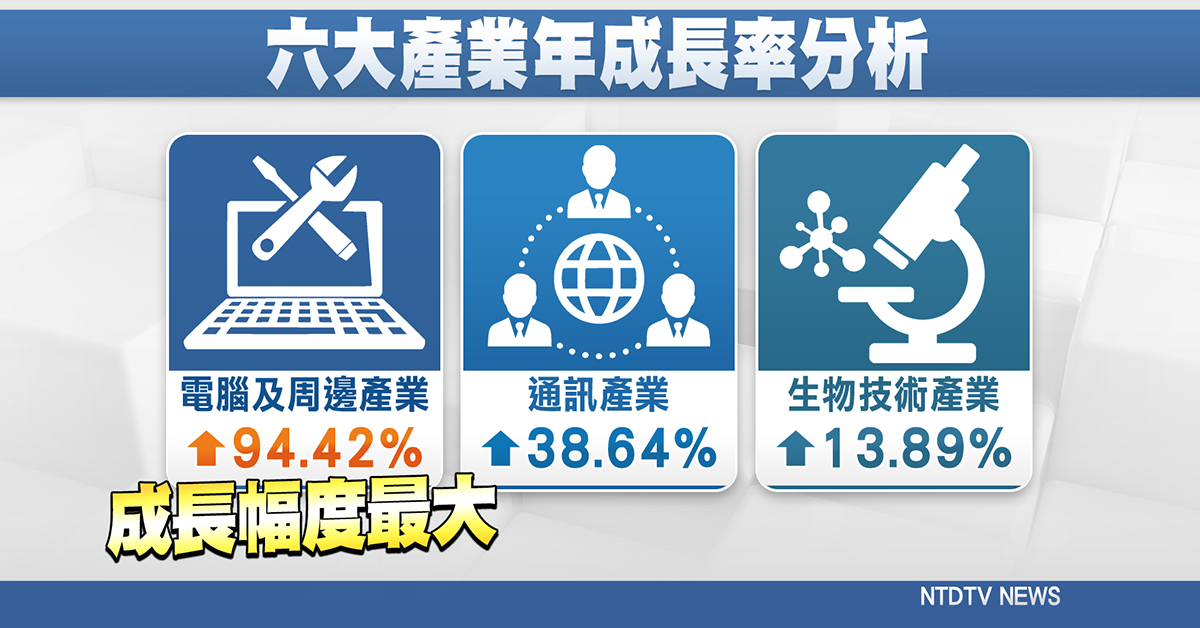 六大產業中,電腦及周邊產業,成長幅度最大,年成長率達到94.42%,其次是通訊產業,成長38.64%,第三是生物技術產業,成長13.89%。南科也在電腦及周邊產業,受到中共肺炎轉單效應,成長10倍以上,至於今年整體營業額,科技部持樂觀看法。