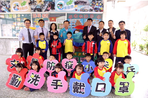 另外,也致贈潘執行長捐贈的口罩給文昌國小學童,同時幫文昌防疫小尖兵吉祥物戴上口罩,貼上「開、戴、壓、密」口訣字樣;隨後到各班視察各項防疫工作是否落實。翁章梁還親自教導小朋友如何正確戴口罩和洗手,同時叮嚀小朋友飲食要營養均衡,早睡早起多運動,提升免疫力,病毒不上身,好處多多。