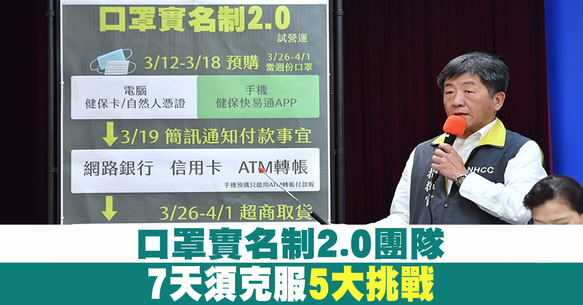 好,「口罩實名制2.0」,新增網路預購、線上付款、超商取貨,官員透露,唐鳳所率領的資訊技術團隊,上周四5日開始,就在第一線測試調整系統。首先是擴大覆蓋率,加入手機認證功能,但為了避免大量網路流量塞爆問題,正在緊鑼密鼓測試,此外必須與健保系統串接,避免人員重複到藥局購買,以及線上金流支付,還有最後的口罩預約取貨問題。目前口罩實名制資訊團隊,密集進行相關工作,希望在7天內克服這5大挑戰,力求3月12日讓「口罩實名制2.0」能夠順利上線、開放預約。