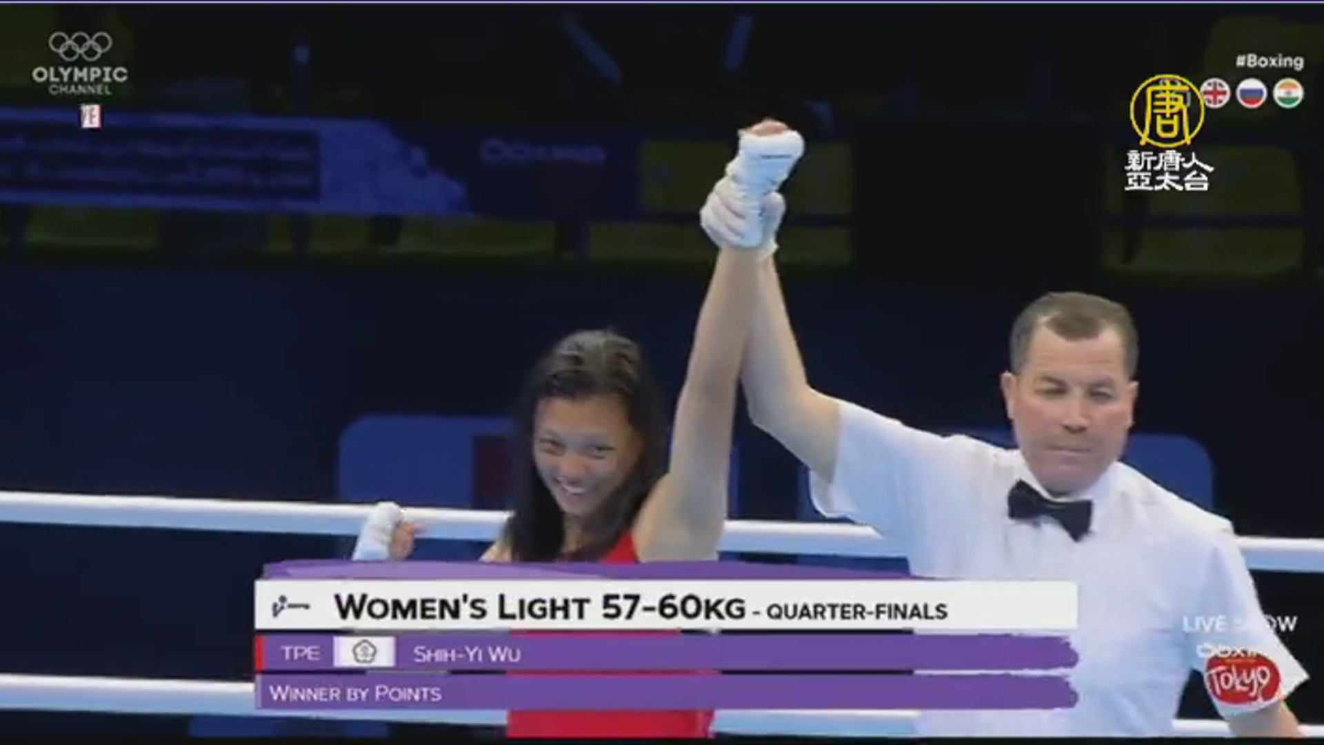 【新唐人亞太台 2020 年 03 月 10 日訊】歡迎回來。在阿曼舉行的奧運拳擊亞太區資格賽,台灣女將大放異彩,陳念琴打頭陣先達標後,林郁婷、黃筱雯、吳詩儀陸續在所屬量級的八強賽獲勝,4人全部挺進四強,也確定都拿下奧運門票。