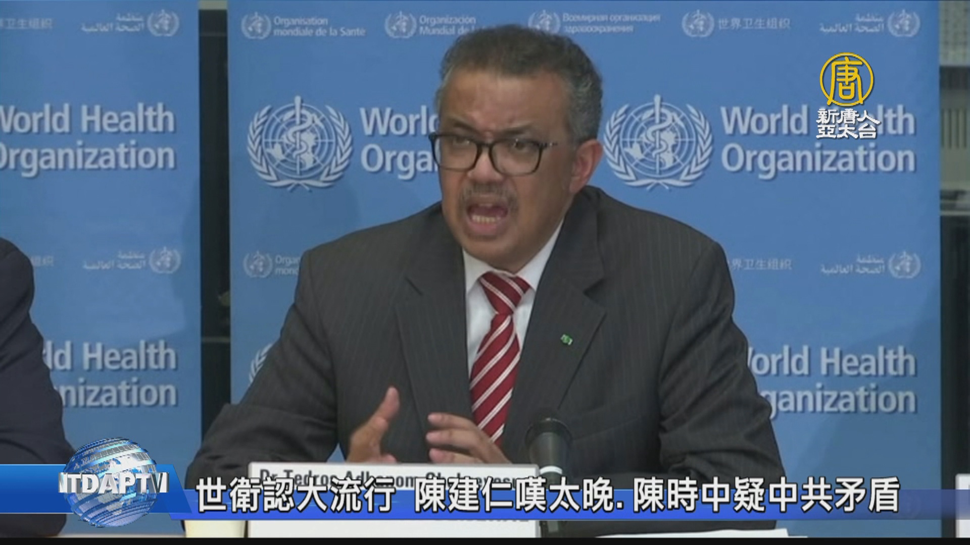 【新唐人亞太台 2020 年 03 月 12 日訊】世衛組織11日終於宣布「全球大流行」,台灣副總統陳建仁昨天痛批譚德塞「敗事有餘」。白宮國安顧問批評中共掩蓋疫情,國民黨主席認為,世衛組織要透明說清楚。北京領導人10日視察武漢,全境數據下降,台灣防疫指揮官陳時中表示,國際都疑惑,這跟台灣要去救援,形成認知矛盾。