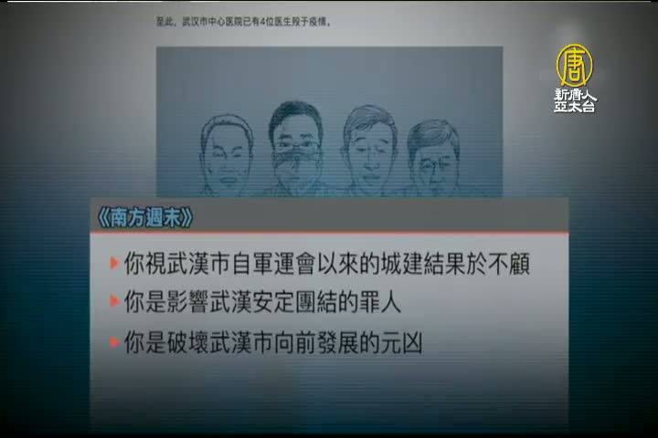 【新唐人亞太台 2020 年 03 月 14 日訊】繼續來關心,中共肺炎已經造成武漢市中心醫院多名醫護人員感染、死亡。自從陸媒《人物》雜誌3月10號刊登《發哨人》文章,被中宣部下令封殺之後,《南方週末》接力,在11號再次發文,披露更多武漢中心醫院高層,打壓「發哨人」的細節。