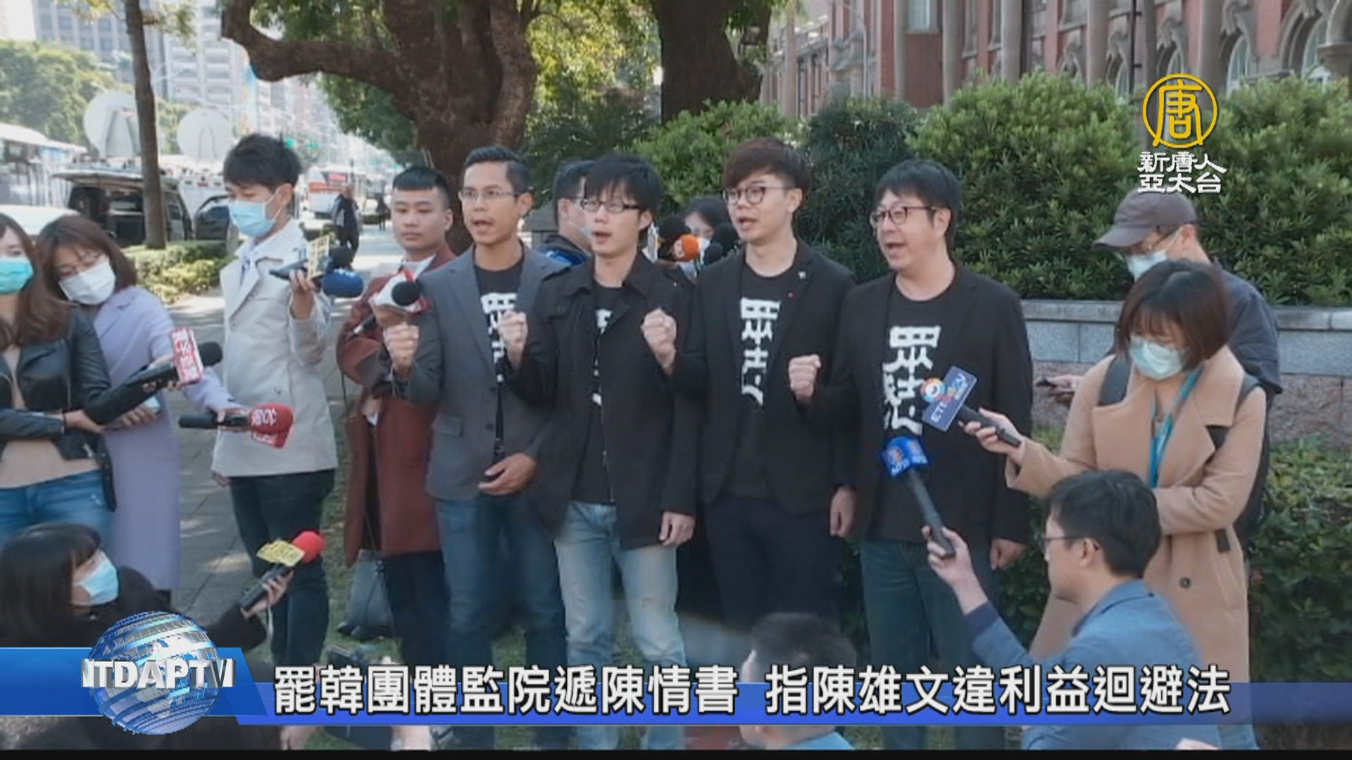 【新唐人亞太台 2020 年 03 月 16 日訊】今日上午,罷韓團體前往監察員遞交陳情書,指高雄市選委會主委陳雄文,行政不中立,違反公務員利益迴避法,希望監查委員能儘快南下調查。