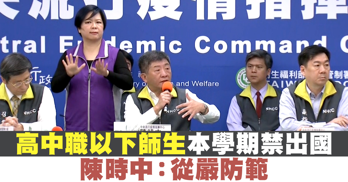 中央流行疫情指揮中心指揮官 陳時中:「院裡也決定,就是說高中以下的師生,停止出國,那到本學期的上課日為止,當然接下來是不是有一些,更嚴厲,或者說相關的一個規定,那我們也跟教育部,就實施的一個細節,跟教育部來談。」