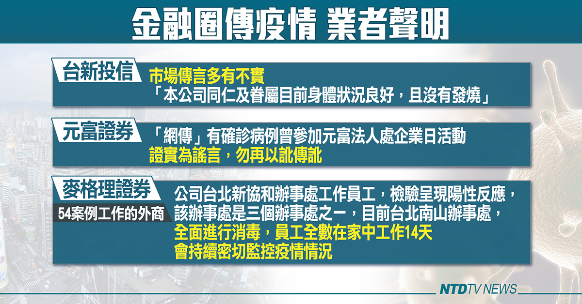 元富證券則是聲明,「網傳」有確診病例曾參加元富法人處企業日活動,證實為謠言,勿再以訛傳訛。