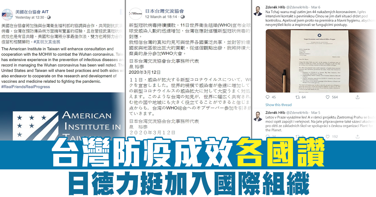 在中共肺炎疫情肆虐全球之際,台灣成為世界各國防疫措施效法對象。美國在臺協會AIT、日本台灣交流協會都在臉書粉絲專業發文稱讚。日本台灣交流協會台北事務所代表泉裕泰12日在官方臉書表示,台灣應對疫情擴散「有很好的對應」,將持續大力支持台灣作為觀察員的身分參加WHO大會。德國在台協會先前也表示「印象深刻」,力挺台灣加入國際組織。歐洲經貿辦事處處長高哲夫也在推特發文,指出台灣是防疫模範。