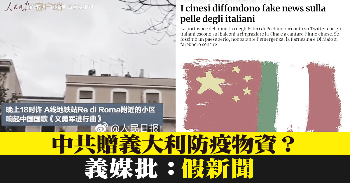 【新唐人亞太台 2020 年 03 月 17 日訊】在全球都在防範中共肺炎之際,中共卻積極營造向外國捐贈防疫物資的形象,日前中共大肆宣傳運送了大量醫療物資給義大利,中共外交官甚至還在推特上po出,義大利人民播放中共國歌感謝他們的影片,義媒獨立調查後揭露,根本就是假新聞。