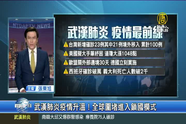 【新唐人亞太台 2020 年 03 月 18 日訊】新聞首先,帶您快速瀏覽今天的疫情重點:台灣新增確診23例,其中21例為境外移入,共累計100例。美國大手筆紓困,力推1.2兆美元刺激方案。歐盟關閉外部邊境30天,德國立刻實施。西班牙確診破萬人,義大利死亡人數已突破2千。