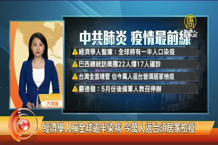 【新唐人亞太台 2020 年 03 月 19 日訊】午報頭條先帶您快速瀏覽,從武漢爆發的中共肺炎,今天有哪些追蹤動態。經濟學人智庫:全球將有一半人口染疫。巴西總統訪美團,22人中有17人確診。台灣全面境管,交通部估計,今天萬人返台皆須居家檢疫。國防部長嚴德發說:5月份後備軍人教召停辦。
