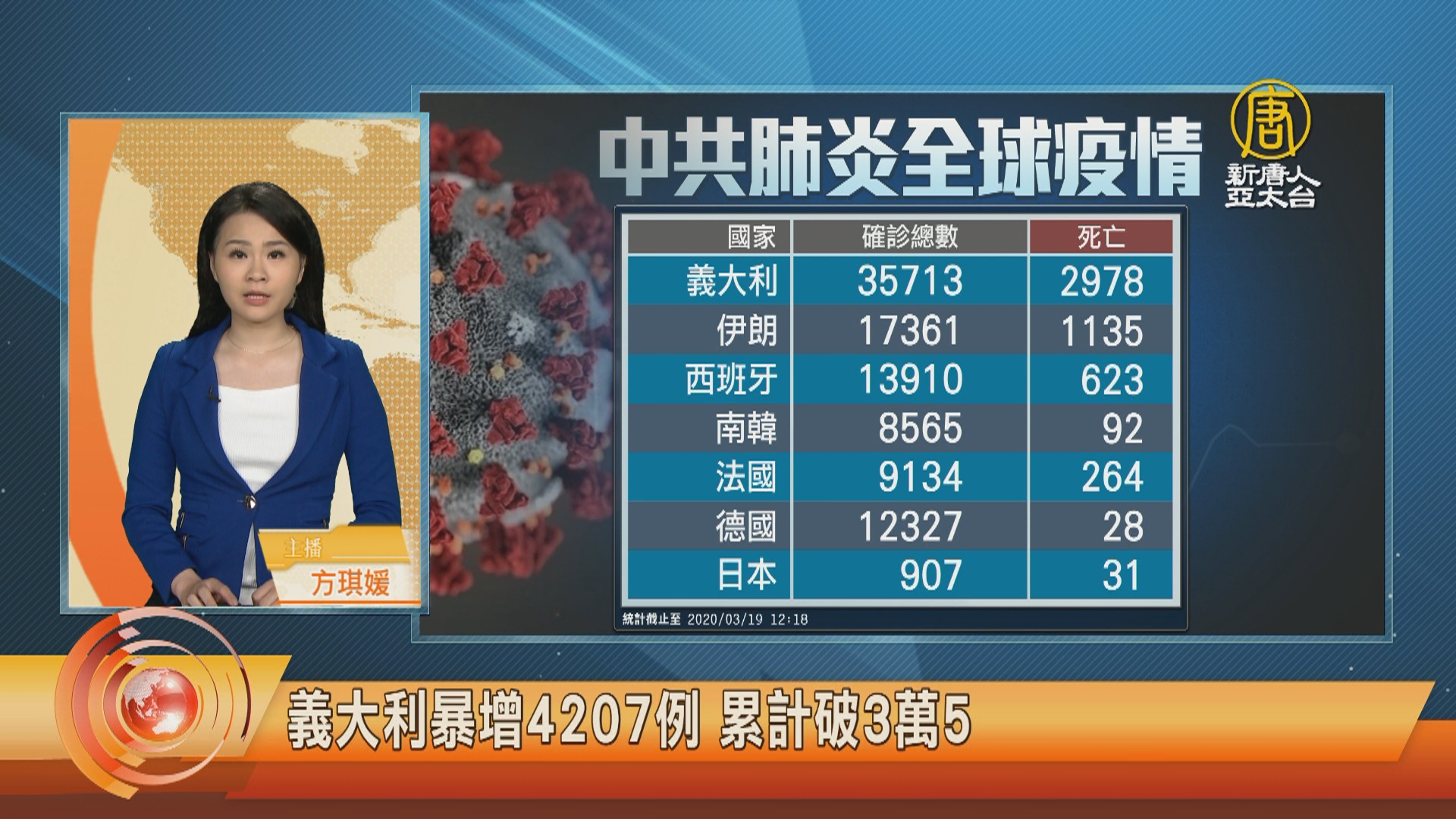 【新唐人亞太台 2020 年 03 月 19 日訊】帶您快速瀏覽,中共肺炎在全球的重災區,在中國大陸之外,疫情最嚴重的義大利,一天內確診激增 4207例,累計確診突破 3萬5千人,死亡近 3千人。其次是伊朗,累計確診達到 1萬7千361例、1千多人死亡。另外,德國累計確診達到 1萬2千多人,成為全球第五個超過一萬人確診的國家。在韓國方面,一天增加 152例,這也是四天以來,韓國單日確診數再次達到百人以上。