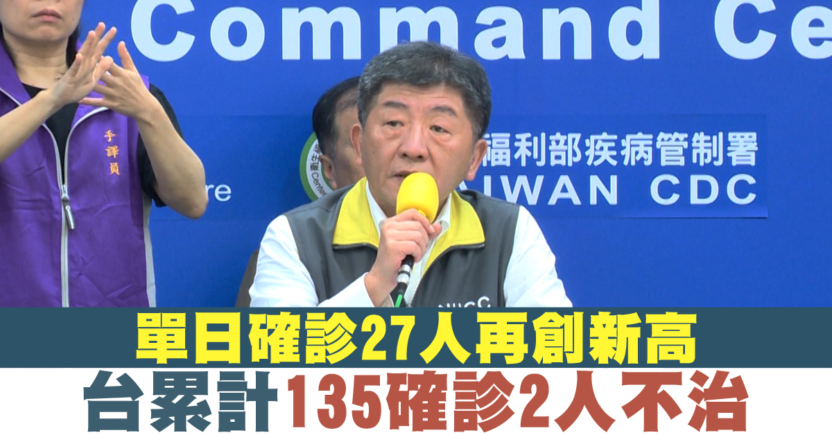 宣布新增27例確診,台灣確診病例,再創單日新高。中共肺炎擴散全球,周五,台灣確診人數累計已經有135人,其中28人解除隔離,但也新增一名死亡個案,累計兩人不治。