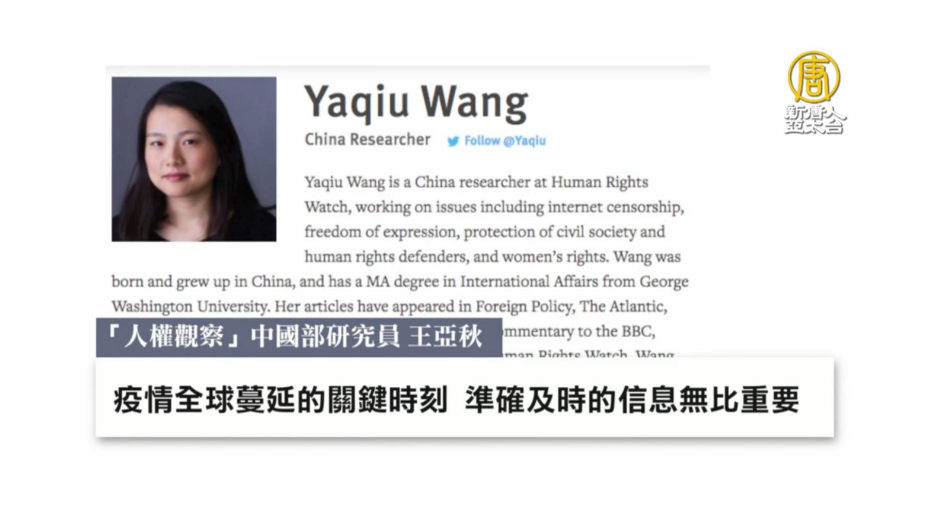 「人權觀察」中國部研究員 王亞秋表示,疫情全球蔓延的關鍵時刻,準確及時的信息無比重要。