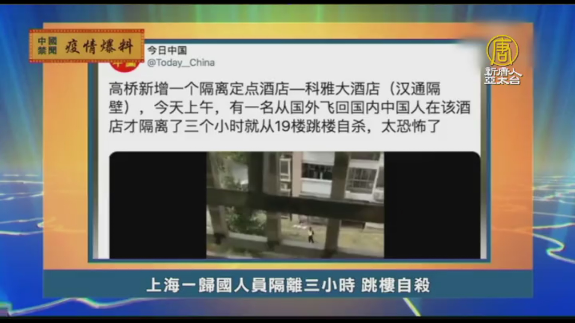 一名聽信中共虛假宣傳的歸國「避疫」人員,3月19號,在上海高橋科雅大酒店隔離點跳樓自殺,上傳視頻的網友說,死者從國外飛回國內才隔離了三個小時。有網友估計,他可能是對中共黨國的信心崩潰了,回國前後的預期差別太大。