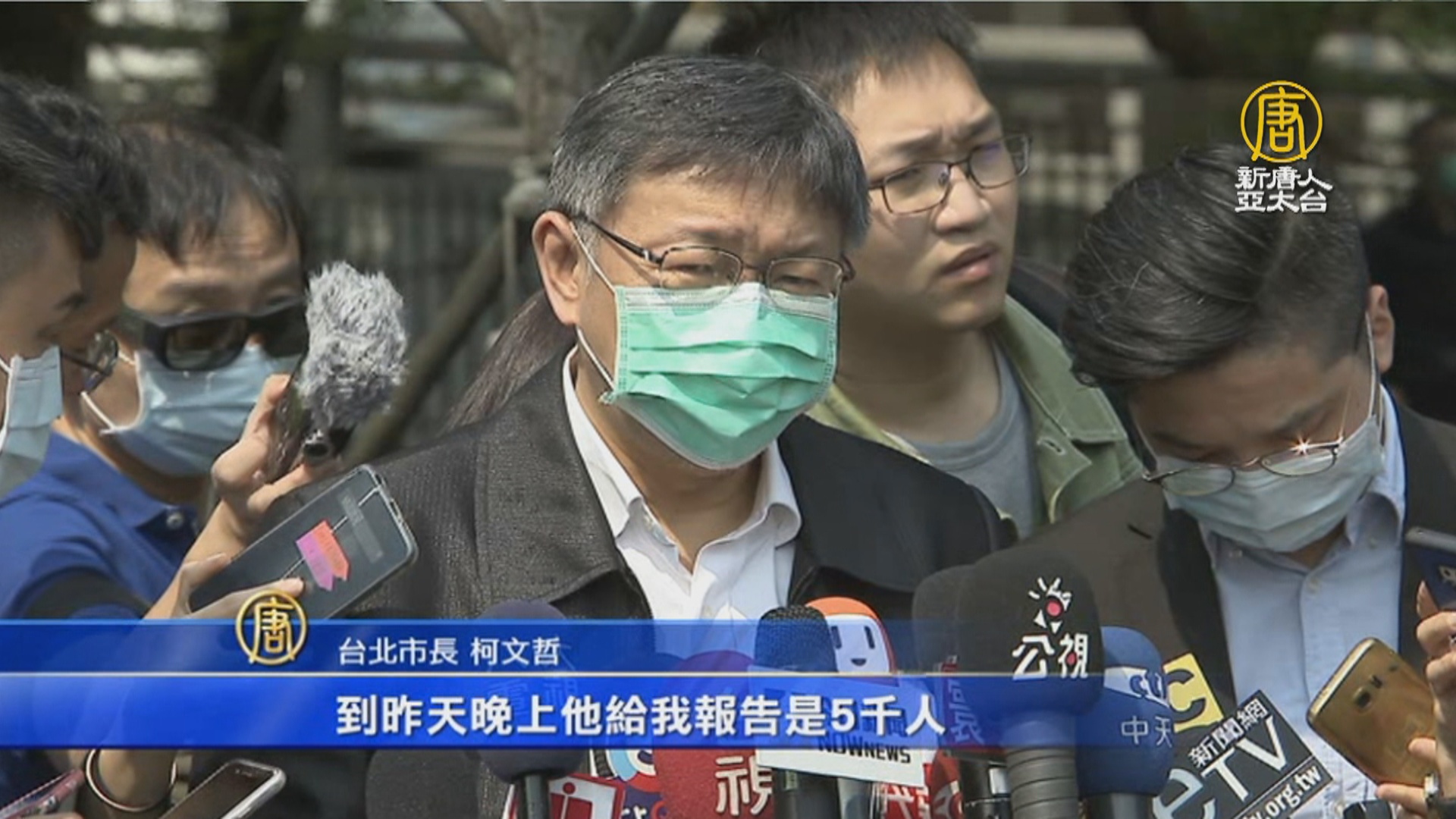 台北市長 柯文哲:「我大概看過一下我們台北市居家檢疫,到昨天晚上他給我報告的是5千人,天啊!一下子進來太多,所以恐怕老實講,這有點超過我們平常應付防疫的容量,這幾天就忍耐一下口罩戴上去,我們這波撐過去,大概就擋過第二波攻擊了。