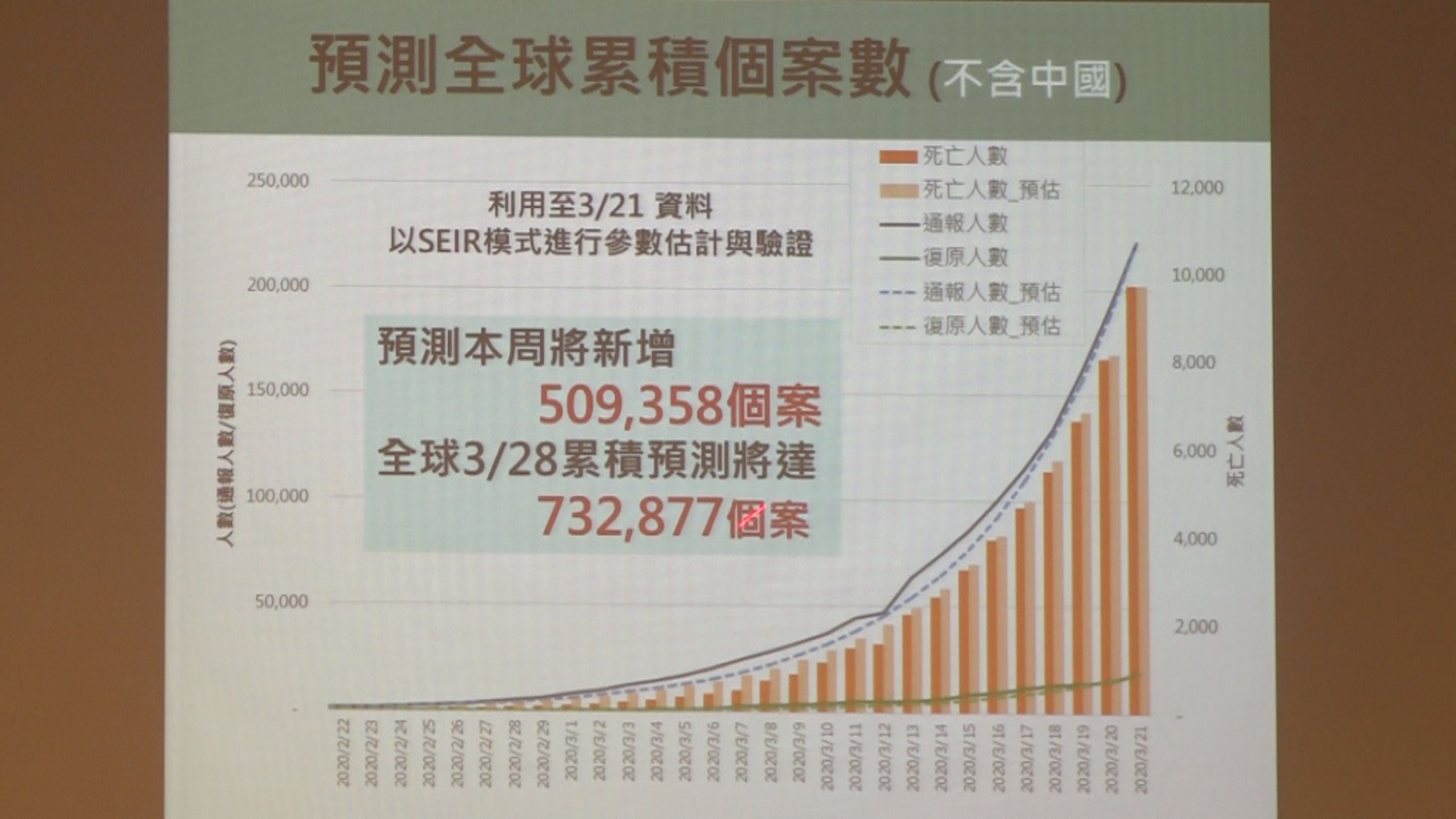 台大公衛學院副院長陳秀熙:「那我用另外一種語言,它已經不是一個生物病毒,它是一個社交病毒。推估本週,我們認為全球可能會新增51萬的個案,到3月28日,扣掉中國,它的個案會達到73萬2877個個案。如果以這樣的推估,我們目前在這個病例再生數之下的,我們的疫情,在對於本土疫情來講。流行控制算是還不錯的。中國大陸絕對不可能所有人都已經感染,他們大概還有3分之2的族群是沒有被感染的。這一群沒有被感染的人,如果將來有政策的改變,包括解開了邊境,是不是會從歐美國家回到中國大陸,而造成第二波的感染,這個我們不敢在這個地方做太多的臆測,但是它的可能性是有的。」