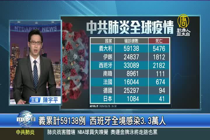 【新唐人亞太台 2020 年 03 月 23 日訊】接著帶您瀏覽中共肺炎在全球各地的最新災況,義大利23日確診病例已累計5萬9千多人、5千476人死亡。被質疑嚴重低報的伊朗,官方累計確診達到2萬4837人,1千812死亡。德國確診人數來到2萬5297例,死亡94人。西班牙累計確診3萬3千多例,新增 462人死亡,累計2千1百多人死亡。法國累計確診達到1萬6千多人,674人死亡。