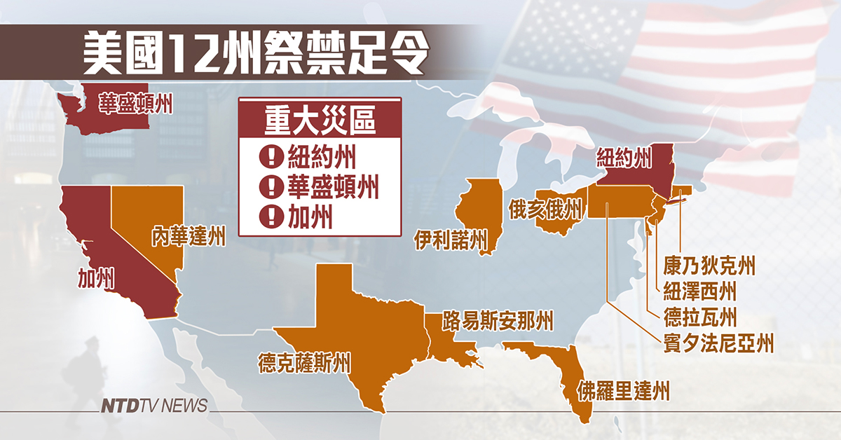 就怕疫情再擴大,疫情最嚴重的紐約州,請出知名演員呼籲民眾不要外出。《華爾街日報》(The Wall Street Journal)報導,目前已經有12個州陸續宣布實施不同程度的禁足令,包括紐約州(New York)、康乃狄克州(Connecticut)、紐澤西州(New Jersey)、德拉瓦州(Delaware)、賓夕法尼亞州(Pennsylvania)、俄亥俄州(Ohio)、佛羅里達州(Florida)、伊利諾州(Illinois)、路易斯安那州(Louisiana)、德克薩斯州(Texas)、內華達州(Nevada)以及加州(California)等。另外紐約州、華盛頓州(Washington)還有加州,都已經被列為重大災區。