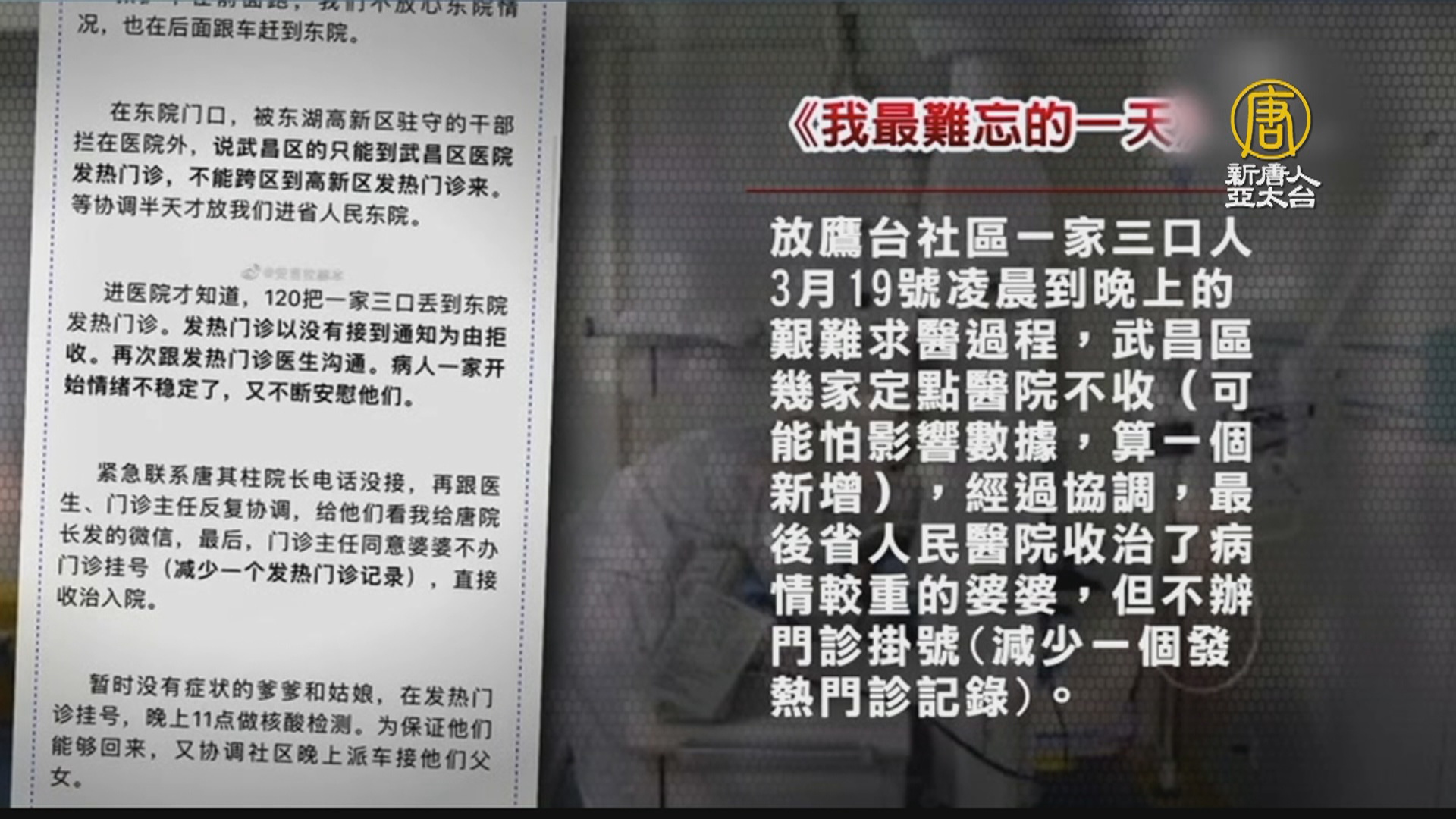 據官方通報,湖北連續5天無新增中共病毒確診病例, 但是湖北一位主流媒體記者以親身經歷《我最難忘的一天》一文披露官方通報不實,文中提到:放鷹台社區一家三口人3月19號凌晨到晚上的艱難求醫過程,武昌區幾家定點醫院不收(可能怕影響數據,算一個新增),經過協調,最後省人民醫院收治了病情較重的婆婆,但不辦門診掛號(減少一個發熱門診記錄)。