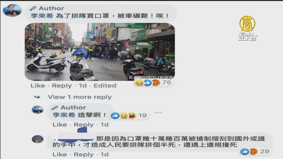 【新唐人亞太台 2020 年 03 月 23 日訊】全國公務人員協會榮譽理事長李來希,日前在臉書PO出照片,指新竹一名女騎士,為了排隊買口罩,慘遭貨車輾斃,立委王定宇認為是造謠,刑事局獲報後經初步調查,發文圖中的車禍案件是為閃避違停車輛才導致車禍死亡的,而李來希發文內容顯有故意混淆視聽之嫌。要求到案說明,但今天表示他沒到。法務部長蔡清祥,今天到立法院備詢,被問到檢調是否已經著手調查?蔡說,已蒐集相關證據。