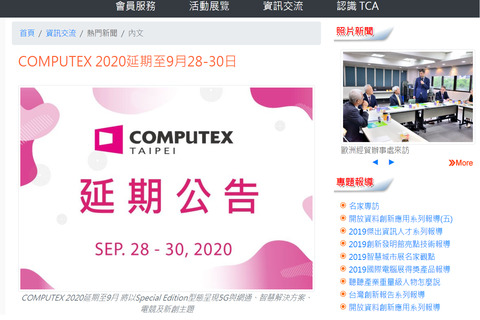 COMPUTEX 2020延期至9月 將以Special Edition型態呈現5G與網通、智慧解決方案、電競及新創主題。(畫面來源:翻攝自台北市電腦公會官網)