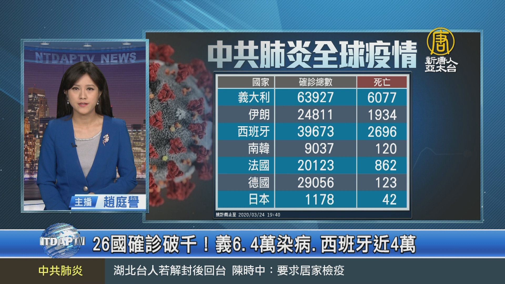 【新唐人亞太台 2020 年 03 月 24 日訊】再來帶您快速瀏覽中共肺炎最新疫情,目前全球已蔓延 172個國家,其中有26國的確診人數都破千,疫情慘重的義大利,累計確診近 6萬4千人、超過6千人死亡。被質疑嚴重低報的伊朗,官方累計確診 2萬4千多人,1千9百多人死亡。西班牙新增確診6千584起,逼近4萬人、2千696人死亡。另外南韓突破9千例,單日增加 76人,累計死亡 120人。法國確診數破2萬,全國禁足令將可能持續好幾週。德國確診人數已經接近 3萬人。
