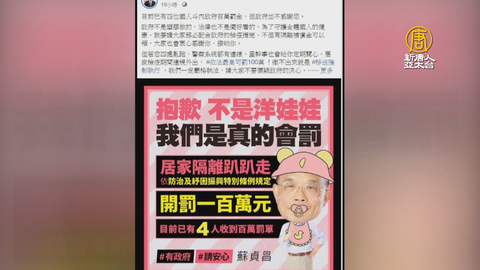 居家檢疫趴趴走真的會罰 蘇貞昌宣導梗圖又獲讚