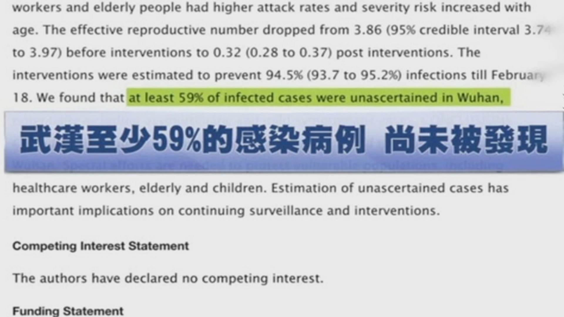 華中科技大學公共衛生學院院長鄔堂春團隊,3月6日在醫學論文預印本平台medRxiv發布論文,該團隊基於武漢衛健委截至2月18日的25961例實驗室確診病例,建立模型分析估計,武漢至少59%的感染病例尚未被發現,其中可能包括無症狀和症狀較輕的病例。國際權威的《自然》網站3月20號引用了這一結論。